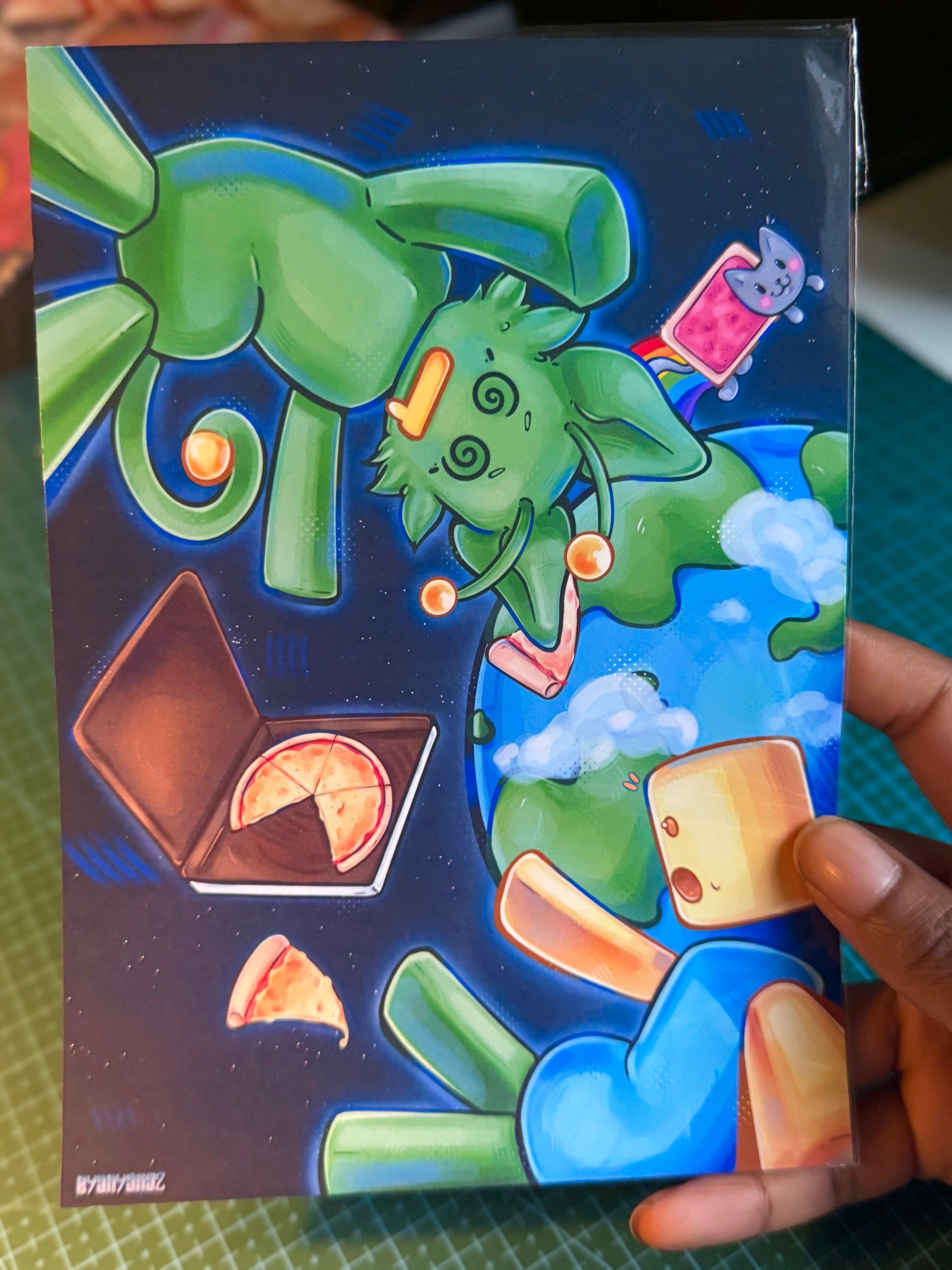Join Gnarpie and the silly noob in their space adventures with this fun print! Travel through the galaxy and discover new worlds in a quirky and playful way. Perfect for those who don't take themselves too seriously. (Spaceship not included!)